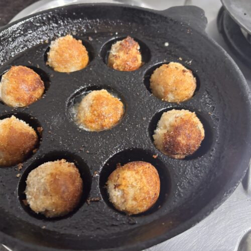 Fry at medium heat in an appam maker or any vessel having cavity until golden and crisp.