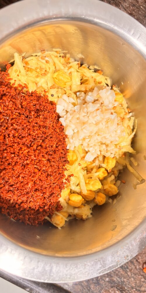 In a bowl, add soaked chickpeas. Mix with grated mangoes and methi(fenugreek) seeds.