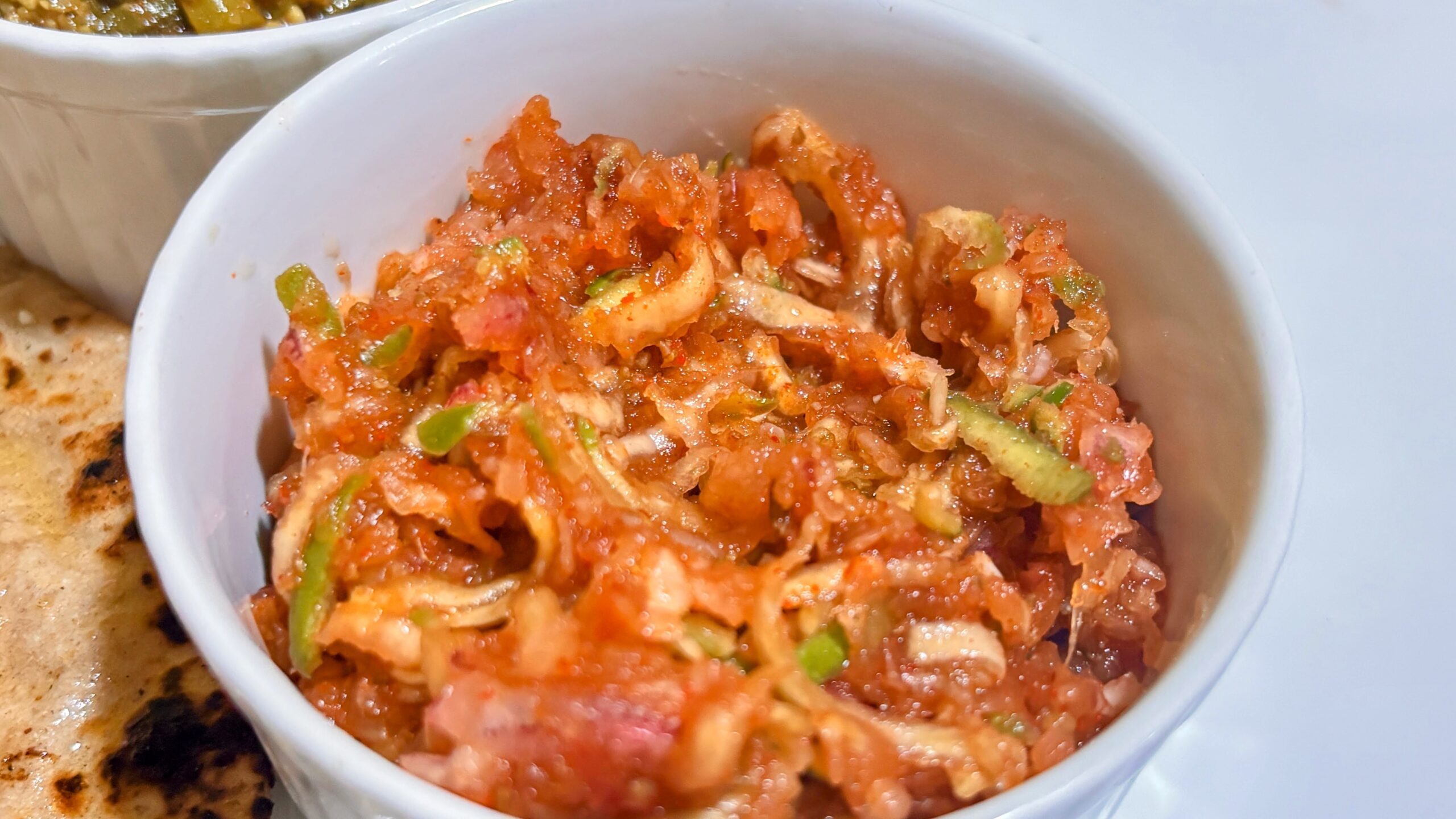 In a mixing bowl, combine grated raw mango and chopped onion.