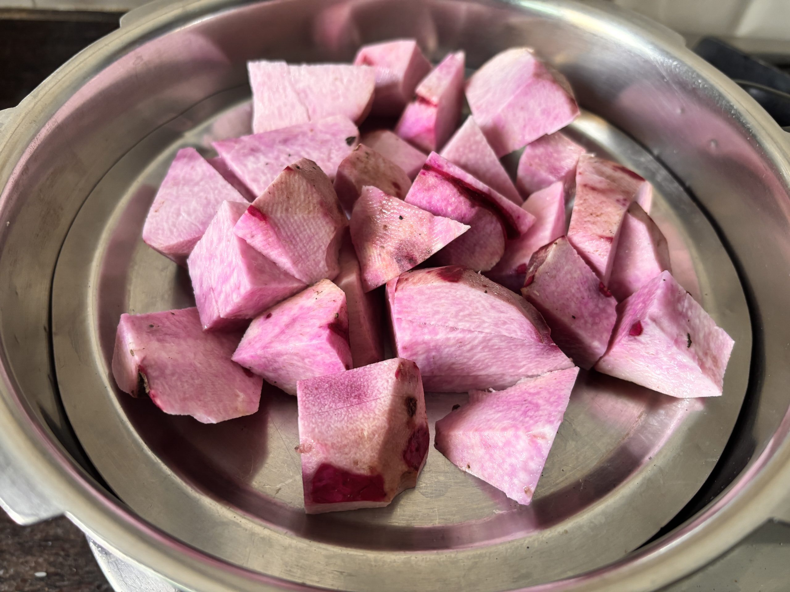 2.Pressure cook the yam pieces until soft, taking care that the pieces ratain shape and not too muuch mushy.