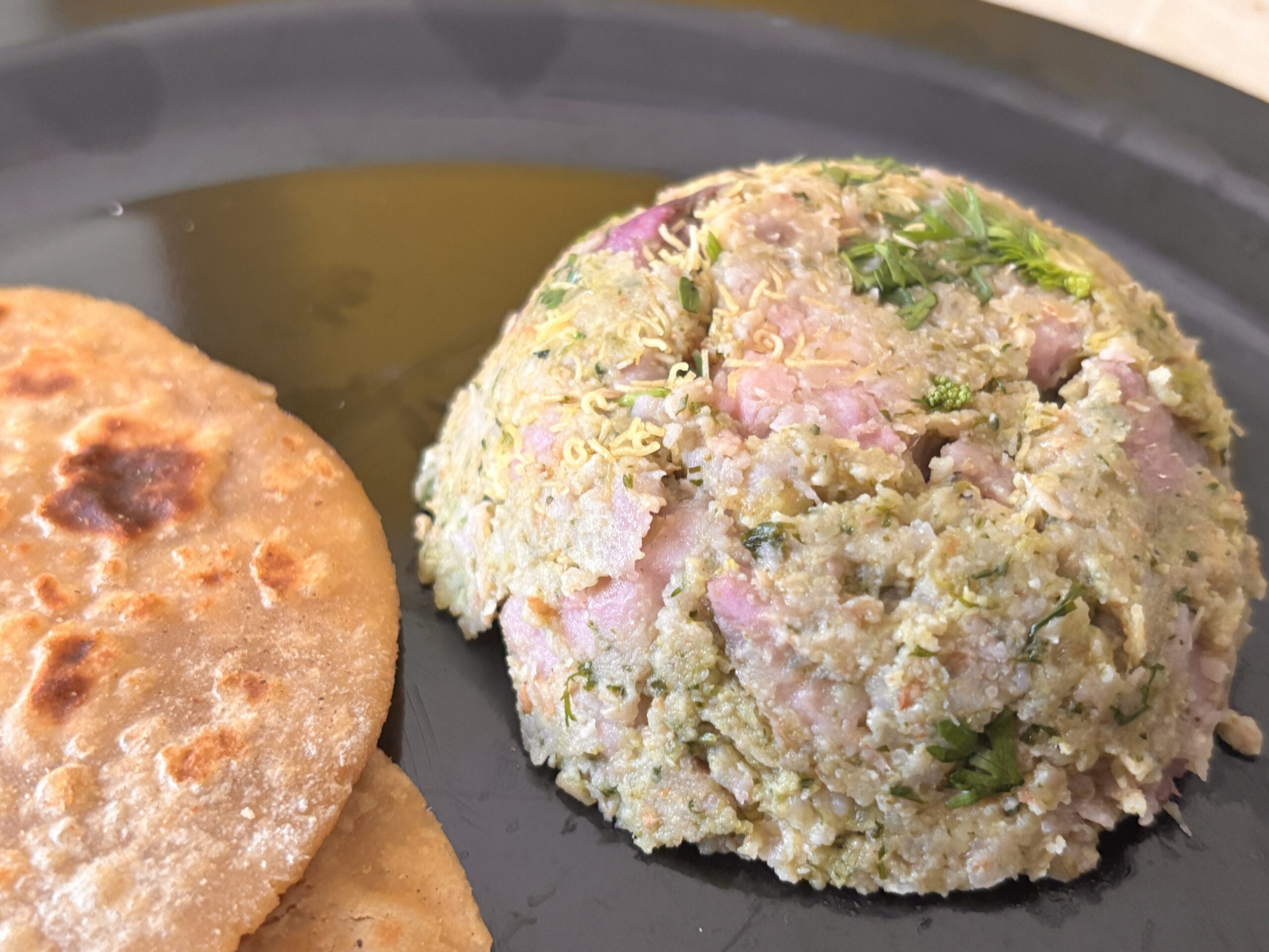 6.While the mixture is warm, stuff it into the paratha. Sprinkle with fresh coriander and bhel bhujia.
